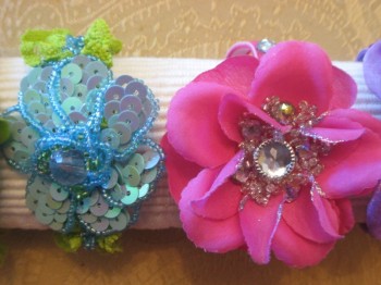 I used more of the green lace (with turquoise elastic attached to the back) for the next couple. She had really liked it and I had some left. For the first one, I picked up the turquoise by attaching a sequin and seed bead flower.