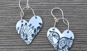 by Lynda Carson. (Spring Valley, California USA) These two pair of earrings were made using aluminum sheeting. Tracing, cutting, filing and sanding the shapes. Aluminum is cheap, light weight, and fairly easy to cut with kitchen shears. I wanted to see what would happen if I tried two different inking methods of embellishment. The birds … Continue reading Inks and Aluminum