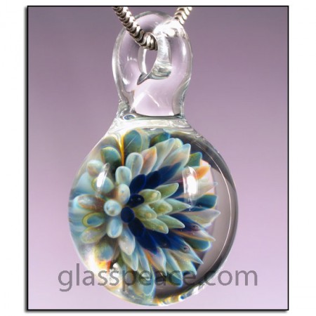 This sea anemone pendant is one of my favorites. I made it by drawing with small rods of glass called stringers on to the end of a flattened clear glass rod. I used borosilicate glass with the lamp work technique and an oxy/propane torch.