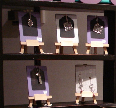 I believe that handmade jewelry is art, hence, the little easels. I have attached my pendants to the wooden plaques with tiny hooks so they can be picked up and touched, and are easily removed.