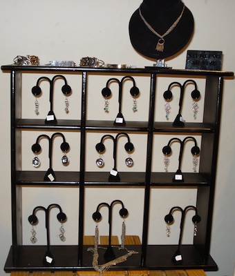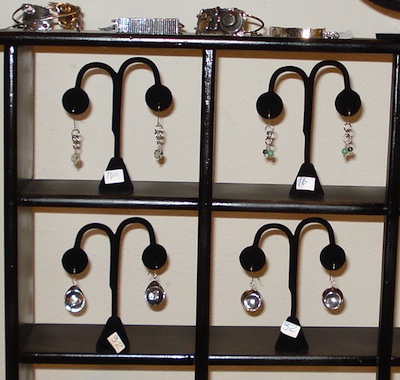 Closeup of earrings on display in the second shelf unit